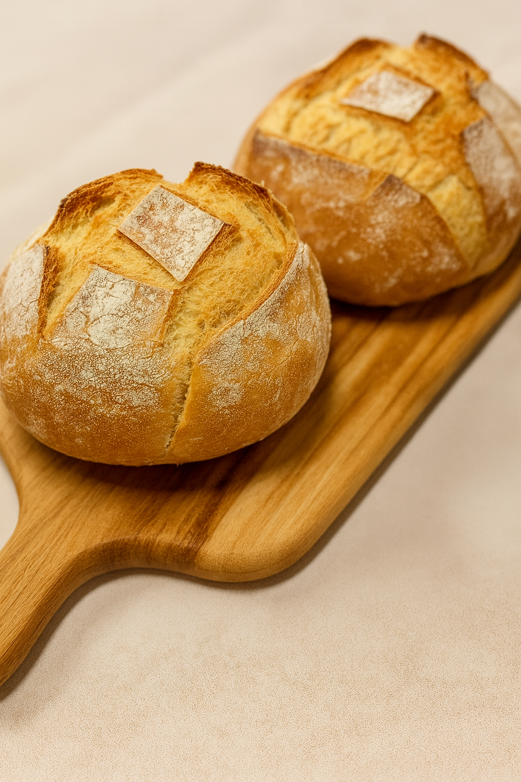 Casca firme e levemente crocante, com miolo macio e bem aerado.